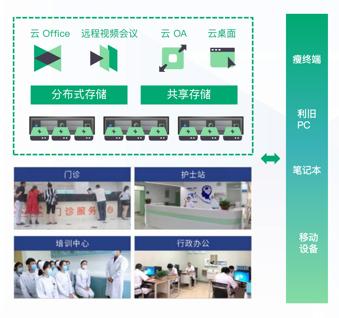 这些设备不仅占用大量机房空间,且因品牌、系统版本各异形成 “信息孤岛”:不同科室终端分属不同管理系统,医护人员需切换多套界面完成工作,IT 团队终端故障处理压力大,影响医疗服务连续性。